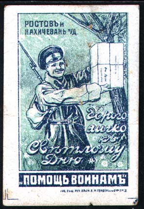 1915 1915(?) г. Разм. рамки ≈ 38 х 55 мм. Двухцветная печать на толстой желтоватой бумаге с мелованным верхним слоем. В центре солдат держит в руках посылку с пасхальными подарками. Слева сверху текст в две строки: «Ростов и Нахичевань н/Д.». Слева внизу текст в пять строк: «Дорого яичко к Светлому Дню». Внизу в отдельной рамке текст в одну строку: ««Помощь воинам»». Справа внизу выходные данные мелким шрифтом: «Акц. Общ. Печ. дела А.М.Гордон с С-м Р. н/Д.». По углам знака разграничительные линии.