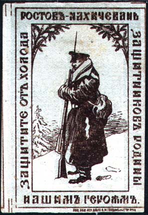 1915 1915(?) г. Разм. рамки 43 х 67 мм. Одноцветная печать на сероватой бумаге с мелованным верхним слоем. В двойной рамке в центре часовой на посту в зимнем обмундировании. По периметру между рамками текст: «Ростов-Нахичевань нашим героям. Защитите от холода защитников Родины». Внизу справа под рамкой мелким шрифтом выходные данные: «Акц. Общ. Печ. дела А.М.Гордон с С-м Р. н/Д.».