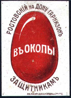 1916 1916 г. Разм. 43 х 62 мм. Двухцветная печать на серо-ватой бумаге с мелованным верхним слоем. В центре пасхальное яйцо, на котором текст: «В окопы». Сверху полукругом текст: «Ростовский-на-Дону гарнизон». Внизу полукругом текст: «Защитникам». Внизу мелким шрифтом выходные данные: «Акц. Общ. Печ. дела А.М.Гордон с С-м Р. н/Д.».