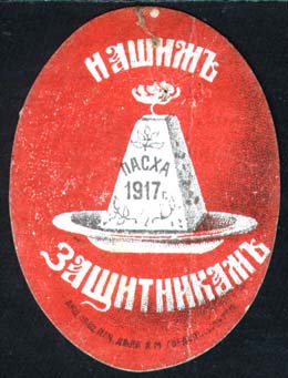 1917 1917 г. 14.03.1917 г. Овал разм. ≈ 41 х 56 мм. Двухцветная печать толстой желтоватой бумаге с мелованным верхним слоем. В центре на тарелке пасхальный кулич с текстом в две строки: «Пасха 1917 г.». Текст: «Нашим защитникам». Внизу полукругом выходные данные мелким шрифтом: «Акц. Общ. Печ. дела А.М.Гордон с С-м Р. н/Д.».