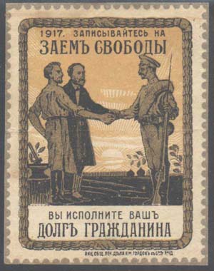 1917 1917 г. Разм. рамки 41 х 55 мм. Многоцветная печать на белой бумаге. В центре в декоративной рамке рабочий и крестьянин пожимают руку солдату на фоне восходящего солнца. Слева молот и наковальня. На заднем плане поле и купола церкви. Сверху текст в две строки: «1917. Записывайтесь на Заем Свободы». Внизу продолжение текста в две строки: «Вы исполните Ваш долг гражданина». Справа внизу под рамкой выходные данные мелким шрифтом: «Акц. Общ. Печ. Дела А.М.Гордон с С-м Р н/Д.». По наружному периметру рамки имитация зубцовки.