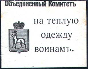 1915 1915(?) г. Разм. 50 х 40 мм. Одноцветная печать на белой бумаге. Сверху текст: «Объединенный Комитет». Ниже справа герб Ростова, слева текст в три строки: «На теплую одежду воинам».