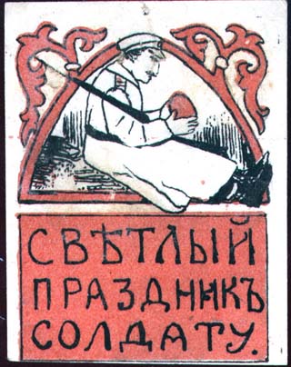 1917 1917 г. 18.03.1917 г. Разм. 52 х 68 мм. Двухцветная печать на белой бумаге. Сверху в декоративной рамке сидящий солдат с винтовкой и с пасхальным куличом в руках. Внизу в прямоугольной рамке текст в три строки: «Светлый праздник солдату».
