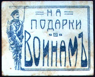 1916 1916 г. 20.12.1916 г. 1916 г. (20.12.1916 г.) Разм. рис. 49 х 38 мм. Одноцветная печать на белой бумаге. В двойной прямоугольной рамке слева солдат с винтовкой. Справа текст в три строки: «На подарки воинам».
