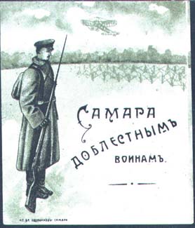 1915 1915 г. 20.-21.11.1915 г. Разм. 45 х 56 мм. Двухцветная печать на белой бумаге. На переднем плане солдат с винтовкой. На заднем плане проволочные заграждения. В небе летящий самолет. В центре справа текст в три строки: «Самара доблестным воинам». Слева внизу выходные данные мелким шрифтом: «Пт. Бр. Евдокимовы. Самара».
