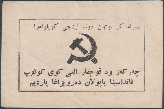 1928 1928(?) г. Разм. 94 х 62 мм. Одноцветная печать на белой бумаге. В двойной прямоугольной рамке разм. 74 х 42 мм в центре серп и молот. Сверху текст на узбекском языке арабским шрифтом. Внизу текст в две строки на узбекском языке арабским шрифтом.