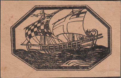 1915 1915(?) г. Разм. 69 х 44 мм. Одноцветная печать на плотной сероватой бумаге. В двойной восьмиугольной рамке разм. 57 х 32 мм. Рисунок парусника в движении. Паруса в виде флагов.