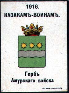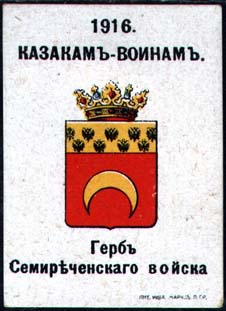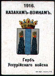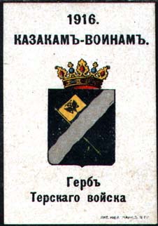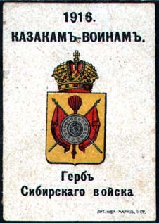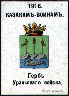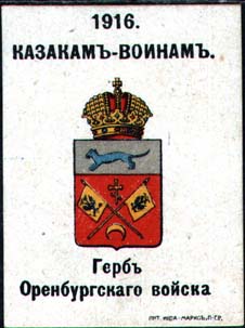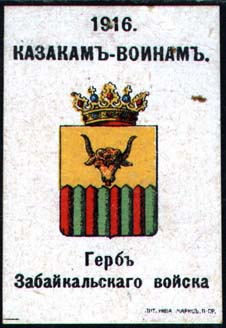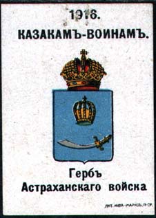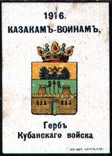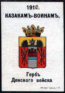 1916 1916 г. Разм. ≈ 38 х 52 мм. Многоцветная печать на желтоватой бумаге с мелованным верхним слоем. В центре гербы казачьих войск. Сверху текст в две строки: «1916 казакам – воинам». Внизу под гербом пояснительный текст. Внизу справа мелким шрифтом выходные данные: «Лит. Нива–Маркс, П-ГР».