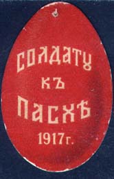 1917 1917 г. Виньетка в форме яйца разм. 42 х 27 мм. Двухцветная печать на плотной сероватой бумаге с лаковым покрытием. В центре текст в три строки: «Солдату к пасхе». Ниже дата: «1917 г.».