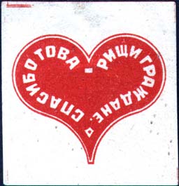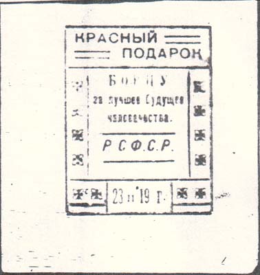 1919 1919 г. 23.02.1919 г. Разм. 63 х 66 мм. Одноцветная печать на толстой желто-зеленой бумаге. В двойной пря-моугольной рамке разм. 36 х 46 мм в центре текст в четыре строки: «Борцу за лучшее будущее человечества. Р.С.Ф.С.Р.». Сверху между рамками текст в две строки: «Красный подарок». Внизу между рамками дата: «23.II.19 г.». Слева и справа декоративные элементы.
