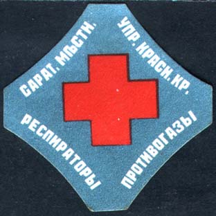 1915 1915 г. 03.07.1915 г. Виньетка в форме ромба с усеченными вершинами и вогнутыми краями разм. 51 х 51 мм. Двухцветная печать на толстой белой бумаге. В центре красный крест. По периметру текст: «Сарат[овское]. Местн[ое]. упр[авление]. Красн[ого]. Кр[еста]. Респираторы и противогазы».