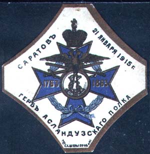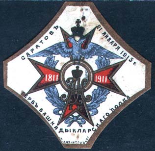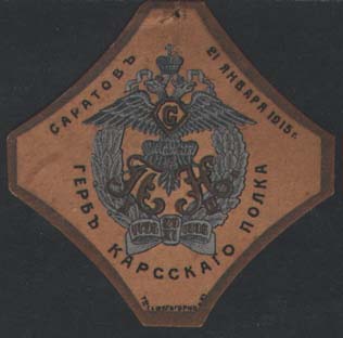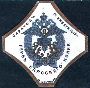 1915 1915 г. 21.01.1915 г. Серия виньеток в форме ромба с усеченными вершинами и вогнутыми краями разм. 51 х 51 мм. Трехцветная и многоцветная печать на сероватой бумаге. В центре изображения полковых гербов с подписями внизу полукругом. Сверху параллельно рамке текст: «Саратов 21 января 1915 г.». Внизу мелким шрифтом выходные данные: «Т-во Шельгорн и К».