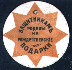 1915 1915 г. 23.11.1915 г. Круг диаметром 37 мм. Двухцветная печать на белой бумаге. Восьмиконечная звезда, в центре которой текст в пять строк: «Защитникам Родины на рождественские подарки».