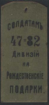1915 1915 г. 01.12.1915 г. Виньетка в виде погона разм. 26 х 58 мм. Двухцветная печать на желтоватой бумаге. Текст в шесть строк: «Солдатам 47-82 дивизий на Рождественские подарки».