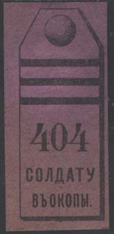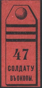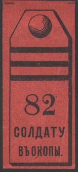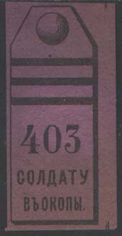 1915 1915 г. 06.12.1915 г. Разм. 25 х 56 мм. Одноцветная печать на тонкой розовой бумаге. Погон с тремя поперечными лычками. Внизу цифры и текст в две строки: «Солдату в окопы».