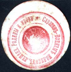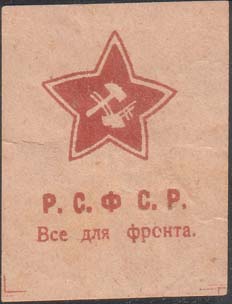 1920 1920(?) г. Разм. 38 х 49 мм. Одноцветная печать на желтоватой бумаге. Сверху пятиконечная звезда с плугом и молотом. Внизу текст в две строки: «Р.С.Ф.С.Р. Все для фронта».