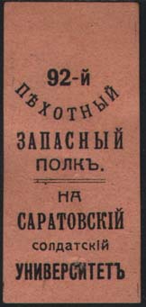 1915 1915(?) г. Разм. 25 х 56 мм. Одноцветная печать на Розово-серой бумаге. Сверху текст в четыре строки: «92-й пехотный запасный полк». Ниже текст в четыре строки: «На Саратовский солдатский университет».