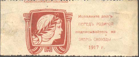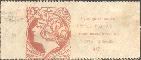 1917 1917 г. Разм. ≈ 84 х 34 мм. Одноцветная печать на желтоватой бумаге. Горизонтальная зубц. 11 1/2. Слева в декоративной рамке голова женщины с лавровым венком. Справа текст в пять строк: «Исполните долг перед Родиной подписывайтесь на Заем Свободы 1917 г.».