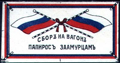 1915 1915(?) г. Разм. 66 х 34 мм. Трехцветная печать на белой бумаге. В прямоугольной рамке цветов российского флага в центре два скрещенных российских флага. Внизу текст в две строки: «Сбор на вагон папирос заамурцам».