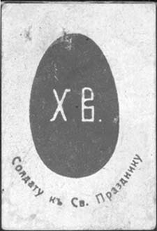 1915 1915(?) г. Разм. 35 х 52 мм. Одноцветная печать на желтоватой бумаге с мелованным верхним слоем. В центре пасхальное яйцо и буквы: «Х.В.». Внизу полукругом текст: «Солдату к Св[етлому]. празднику».
