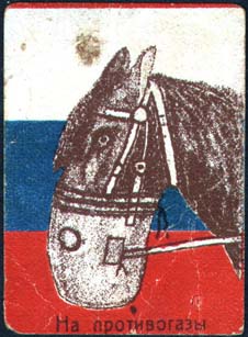 1915 1915(?) г. Разм. 37 х 51 мм. Трехцветная печать на белой бумаге. В центре на фоне российского флага голова лошади в противогазной маске. Внизу текст в одну строку: «На противогазы».