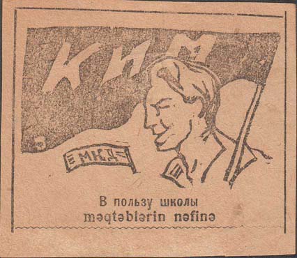 1932 1932 г. 22.01.1932 г. Разм. 72 х 62. Одноцветная печать на желтоватой бумаге. В прямоугольной рамке разм. 66 х 53 мм в центре голова юноши и знамя с аббревиатурой «КИМ». Слева флажок с текстом: «МКД». Внизу текст на русском и азербайджанском языке латинским шрифтом: «В пользу школы».