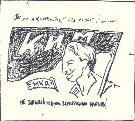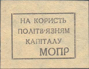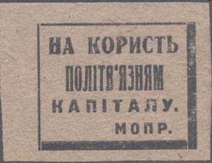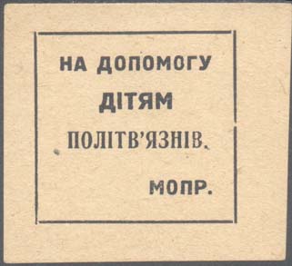 1932 1932(?) г. Разм. 53 х 48 мм. Одноцветная печать на желто-серой бумаге. В центре в прямоугольной рамке разм. 37 х 36 мм текст на украинском языке в три строки: «На помощь детям политзаключенных». В правом нижнем углу аббревиатура «МОПР».