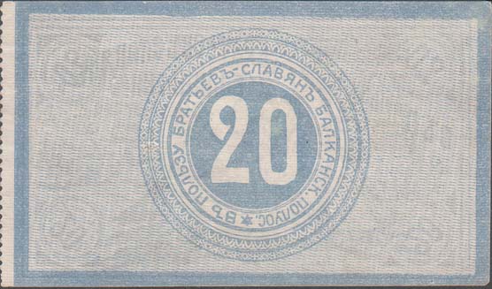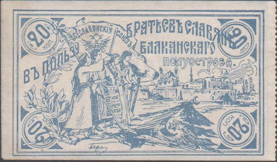 1912 1912 г. Листок из квитанционной книжки разм. рамки 86 х 49 мм. Одноцветная двухсторонняя печать на белой бумаге. Правосторонняя зубц. 11 1/2. На лицевой стороне в тройной прямоугольной рамке аллегорический рисунок : четыре фигуры с мечами, символизирующие балканские славянские государства возле лежащих турецких знамен на фоне города с минаретами. Слева оливковая ветвь и флаг с текстом на полотнище: «Славянский союз». Сверху тест в три строки: «В пользу братьев славян Балканского полу-острова». По углам в двойных круглых рамках номинал. На оборотной стороне в центре на фоне в виде сетки в круглой декоративной рамке из концентрических окружностей номинал. По периметру между рамками текст: «В пользу братьев-славян Балканск[ого]. Полу-ос[трова].».