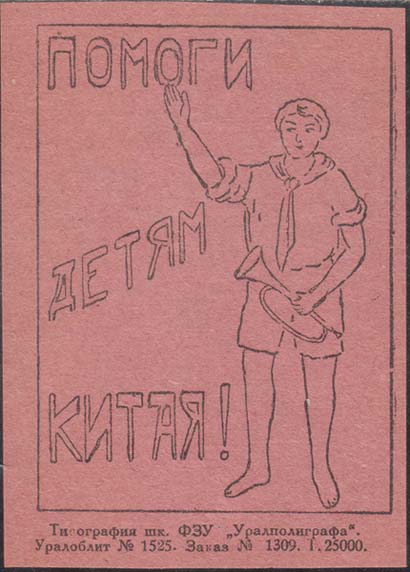 1930 1930(?) г. Разм. 63 х 93 мм. Одноцветная печать на светло-карминово-красной бумаге. В прямоугольной рамке разм. 52,5 х 72 мм справа пионер с горном и поднятой правой рукой. Слева текст в три строки: «Помоги детям Китая!». Внизу мелким шрифтом выходные данные в две строки: «Типография шк. ФЗУ «Уралполиграфа», Уралоблит №1525. Заказ №1309. Т. 25000».