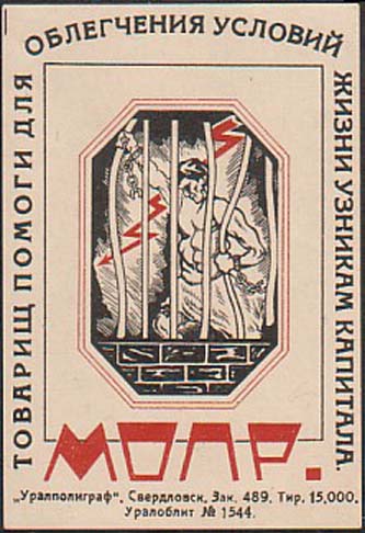 1930 1930(?) г. Разм. 58 х 80 мм. Двухцветная печать на кремовой бумаге. В прямоугольной рамке разм. 43 х 57 мм в центре в дополнительной восьмиугольной рамке заключенный сгибает тюремную решетку. По наружному периметру прямоугольной рамки текст: «Товарищ помоги для облегчения условий жизни узникам капитала. МОПР». Внизу выходные данные мелким шрифтом в две строки: ««Уралполиграф», Свердловск, зак. 598 Тир. 15.000. Уралоблит №1544».