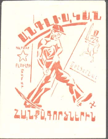 1926 1926(?) г. Разм. 58 х 76 мм. Одноцветная печать на белой бумаге. В центре рабочий с киркой. Сверху и снизу текст на армянском языке: «Английским шахтерам». Слева пятиконечная звезда и текст на армянском языке: «Красная пятница». Справа символическое изображение капиталиста.