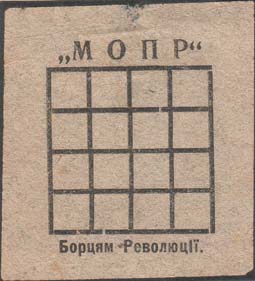 1926 1926(?) г. Разм. 40 х 45 мм. Одноцветная печать на бумаге различных цветов. В центре стилизованное изображение окна с решеткой. Сверху аббревиатура: «МОПР». Внизу текст на украинском языке: «Борцам революции».