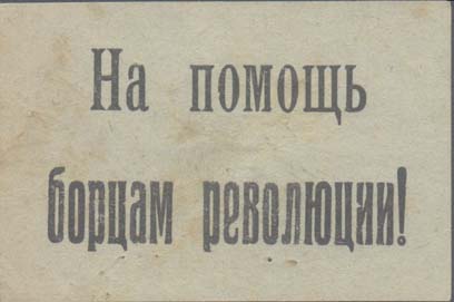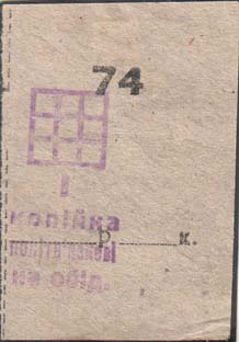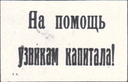 1926 1926(?) г. Разм. 33 х 52 мм. Двухцветная печать на тонкой желто-серой бумаге. В центре текст в две строки: «... (Номер нумератором) ... р. ... к.». Поверх оттиск ручного штампа с символическим изображением решетки и текста в четыре строки: «1 копейка политзаключенному на обед».