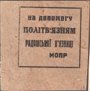 1932 1932 г. 25.08.1932 г. Разм. 50 х 50 мм. Одноцветная печать на толстой желто-серой бумаге. В центре в прямоугольной рамке разм. 36 х 37 мм текст в три строки на украинском языке: «В помощь политзаключенным Радомской тюрьмы». В правом нижнем углу аббревиатура «МОПР».