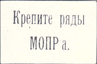 1926 1926(?) г. Разм. рамки 32 х 50 мм. Двухцветная печать на толстой желтоватой бумаге. В прямоугольной рамке в центре эмблема МОПР. Сверху аббревиатура на татарском (арабским шрифтом) и русском языках: «МОПР». Внизу текст в две строки на татарском (арабским шрифтом) и русском языках: «Твой революционный долг – на помощь пленникам капитала!».