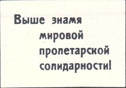 1930 1930(?) г. Разм. 70 х 48 мм. Одноцветная печать на бумаге различных цветов. В центре текст в четыре строки: «Выше знамя мировой пролетарской солидарности!».