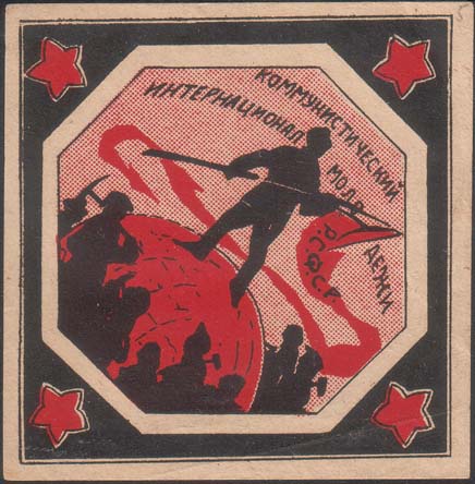 1920 1920 г. 25.07.1920 г. Ромб разм. 96 х 96 мм. Двухцветная печать на белой бумаге. В центре в рамке в форме ромба дополнительная восьмиугольная рамка. В восьмиугольной рамке аллегорический рисунок: на полюсе земного шара стоит рабочий с красным знаменем, на полотнище которого аббревиатура «Р.С.Ф.С.Р.». По краям земного шара рабочие с кирками и молотами. Сверху полукругом текст в две строки: «Коммунистический интернационал молодежи». По внутренним углам ромбовидной рамки пятиконечные звезды.
