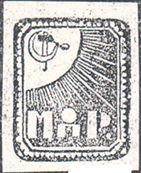 1930 1930(?) г. Разм. 31 х 31 мм. Одноцветная печать на желтоватой бумаге с мелованным верхним слоем. В центре эмблема МОПР. Сверху полукругом текст: «Международная организация помощи борцам». Внизу продолжение текста: «Революции».
