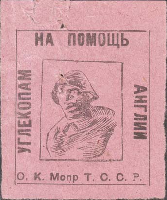 1926 1926 г. Разм. 56 х 65 мм. Одноцветная печать на плотной розовой бумаге. В двойной прямоугольной рамке разм. 47 х 53 мм в центре фигура шахтера. По периметру между рамками текст: «На помощь углекопам Англии О.К. МОПР Т.С.С.Р.».