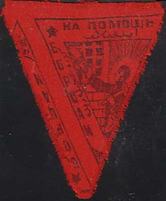 1927 1927 г. 18.03.1927 г. Виньетка в форме перевернутого треугольника разм. 58 х 68 мм. Одноцветная печать на красной материи. В двойной треугольной рамке в центре рабочий с молотом протягивает руку заключенному через решетку. По периметру текст на русском и татарском (арабским шрифтом) языках: «На помощь борцам революции». Внизу дата в три строки: «18/III 1927 г.».