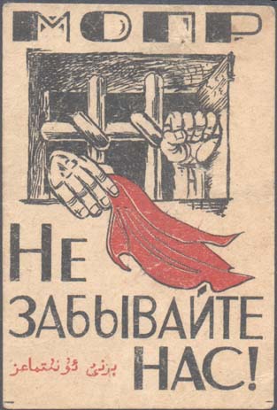 1930 1930(?) г. Разм. 52 х 77 мм. Двухцветная печать на толстой кремовой бумаге. В центре эмблема МОПР. Сверху аббревиатура «МОПР». Внизу текст в три строки: «Не забывайте нас!». Слева внизу текст на татарском языке арабским шрифтом.