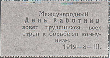 1919 1919 г. 08.03.1919 г. Разм. по перфорации 74 х 41 мм. Одноцветная печать на тонкой бледно-розовой бумаге. Зубц. 11 1/2. В центре текст в шесть строк: «Международный День Работниц зовет трудящихся всех стран к борьбе за коммунизм. 1919-8-III».