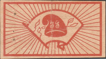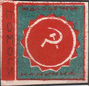 1926 1926 г. Разм. 53 х 48 мм. Двухцветная печать на плотной белой бумаге. Слева вертикальная полоса разм. 8 х 46 мм с текстом: «Помоги». Справа в прямоугольной рамке разм. 40 х 46 мм в центре многолучевая звезда с серпом и мо-лотом в круглой рамке. Сверху продолжение текста «Молодежи». Внизу продолжение текста: «Нанкина».