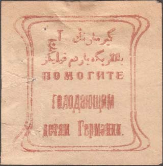 1927 1927(?) г. Разм. 54 х 58 мм. Одноцветная печать на плотной кремовой бумаге. В декоративной рамке разм. 44 х 45 мм сверху текст в две строки на татарском языке арабским шрифтом. Ниже текст в три строки: «Помогите голодающим детям Германии».