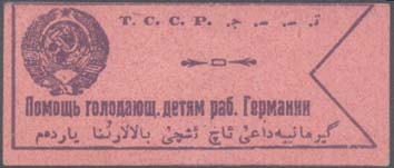 1930 1930(?) г. Разм. 58 х 25 мм. Одноцветная печать на розовой бумаге. В прямоугольной рамке разм. 55 х 22 мм с правым краем в виде фестона слева герб СССР. Сверху аббревиатура «Т.С.С.Р.» на русском и татарском (арабским шрифтом) языках. В центре декоративный элемент. Внизу текст на русском и татарском (арабским шрифтом) языках: «Помощь голодающ[им]. детям раб[очих]. Германии».