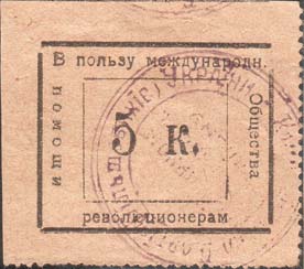 1926 1926(?) г. Разм. по перфорации 46 х 40 мм. Одноцветная печать на желтоватой бумаге. Зубц. 11 1/2. В двойной прямоугольной рамке разм. 36 х 29 мм в центре номинал. По периметру между рамками текст: «В пользу международ[ного]. Общества помощи революционерам». На лицевой стороне фиолетовый оттиск круглой контрольной печати.