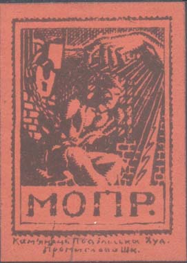 1926 1926(?) г. Разм. 45 х 63 мм. Одноцветная печать на бумаге различных цветов. В прямоугольной рамке разм. 39 х 54 мм аллегорический рисунок: узник разрывает цепи на фоне стены и решетки. Рука с молотком сбивает замок. Внизу аббревиатура «МОПР». Внизу под рамкой мелким шрифтом текст в две строки на украинском языке: «Каменец–Подольская Худ[ожественно]. Промышленная Шк[ола].».