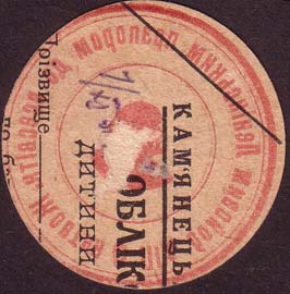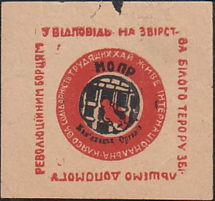 1930 1930(?) г. Разм. 73 х 68 мм. Двухцветная печать на желтоватой бумаге. В центре в двойной круглой толстой рамке диаметром 38 мм эмблема МОПР. По окружности текст на украинском языке: «МОПР Каменецк[ая]. Организ[ация]. Да здравствует интернационально-классовая солидарность трудящихся». Снаружи по периметру текст на украинском языке: «В ответ на зверства белого террора усилим помощь революционным борцам».