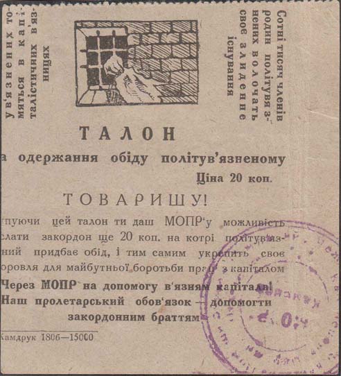 1930 1930 г. Листок из квитанционной книжки разм. 80 х 90 мм. Одноцветная печать на серо-зеленой бу-маге. Сверху зубц. 11 1/2. В центре текст в десять строк на украинском языке: «Талон на получение обеда политзаключенному. Цена 20 коп. Товарищ! Покупая этот талон ты даешь МОПРу возможность послать за границу еще 20 коп. на которые политзаключенный приобретет себе обед, и тем самым укрепит свое здоровье для будущей борьбы с капиталом. Через МОПР на помощь узникам капитала! Наша пролетарская обязанность – помочь зарубежным братьям». Сверху эмблема МОПР. В левом верхнем углу текст в шесть строк на украинском языке: «100000 политзаключенных страдают по капиталистическим тюрьмам». В правом верхнем углу вертикально сверху вниз текст в пять строк на украинском языке: «Сотни тысяч членов семей политзаключенных влачат свое жалкое существование». В левом нижнем углу выходные данные мелким шрифтом: «Кампечать 1806 - 15000». В правом нижнем углу фиолетовый оттиск круглой контрольной печати.