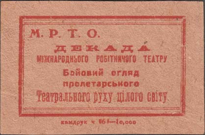1930 1930(?) г. Разм. 70 х 40 мм. Одноцветная печать на толстой желтовато-серой бумаге низкого качества. В прямоугольной рамке разм. 57 х 33 мм текст в шесть строк на украинском языке: «М.Р.Т.О. Декада международного рабочего театра. Боевой фонд пролетарского Театрального движения всего мира». Внизу под рамкой мелким шрифтом выходные данные на украинском языке: «Кампечать 861-10,000».